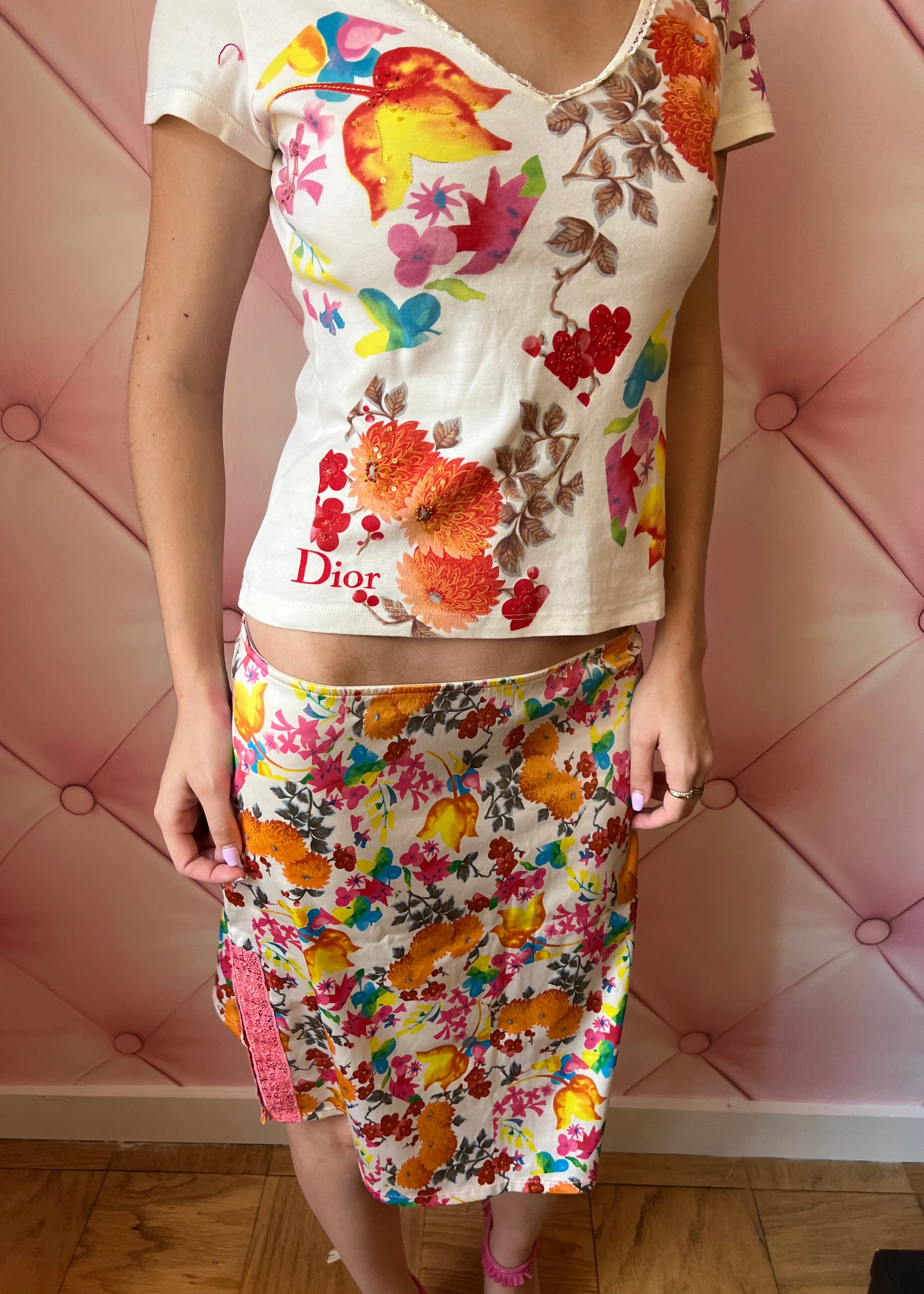 Dior SS2006 Silk Floral Skirt & Embellished V-Neck Tee